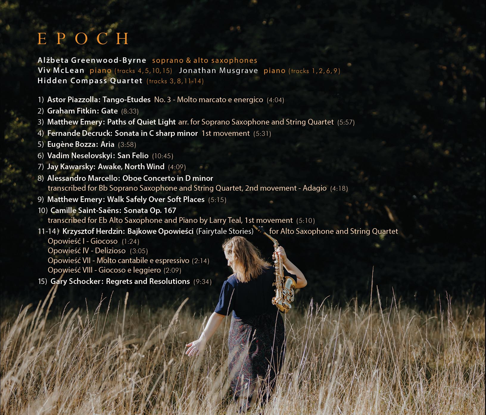 SLOVENČINAEPOCH, her debut album, comprises a selection of music from various periods of Alžbeta's life, with each piece connected to an important memory or milestone and chosen especially to showcase the diversity of this beautiful instrument - the saxophone.
